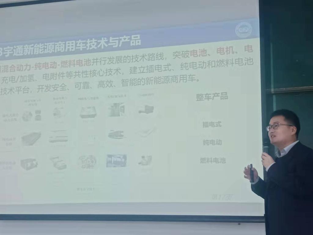 接着,张博士先从自身学习与工作经历为同学们分享人生感悟与经验,又从宇通集团概况、新能源汽车行业情况、宇通新能源商用车技术研发与产品应用、智能驾驶全面赋能未来宇通商用车产品四个方面做了详细报告。整个演讲内容详实、旁征博引,赢得了师生阵阵掌声。