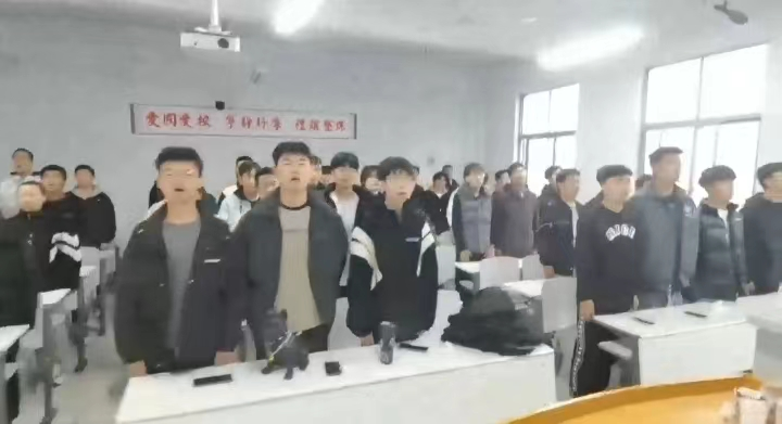思想政治教育进行中,教官组织新生观看红色电影,唱响红歌。