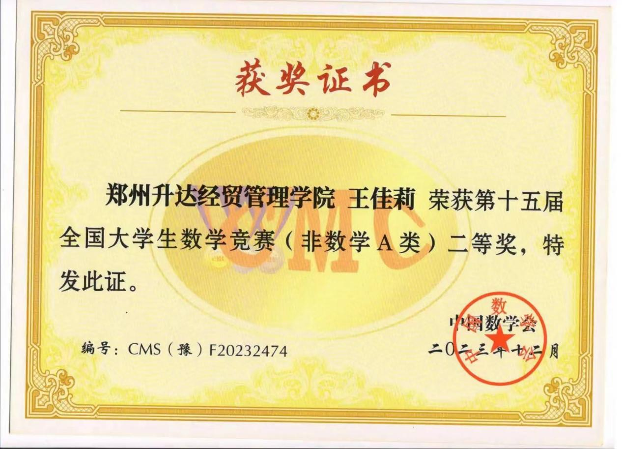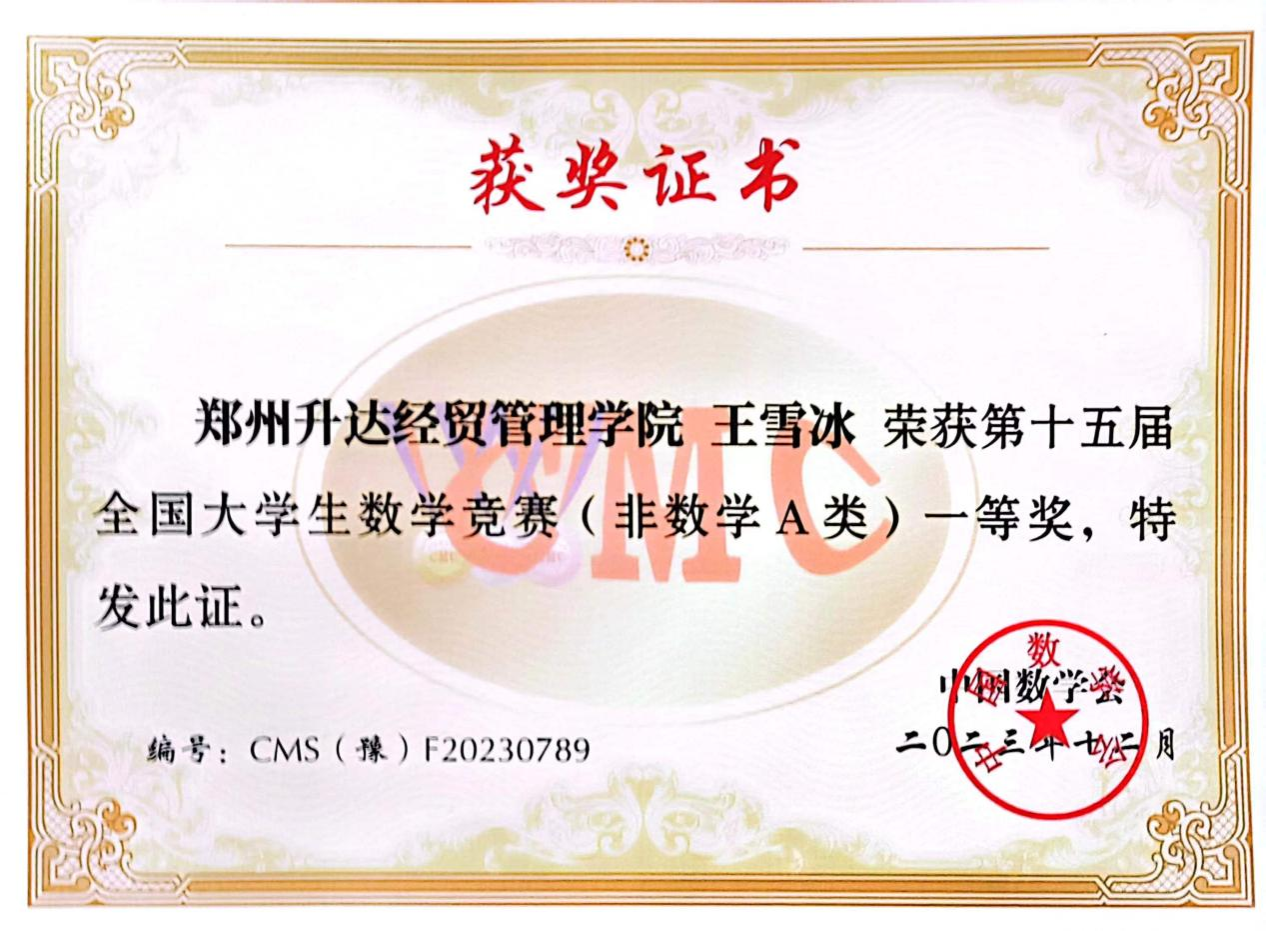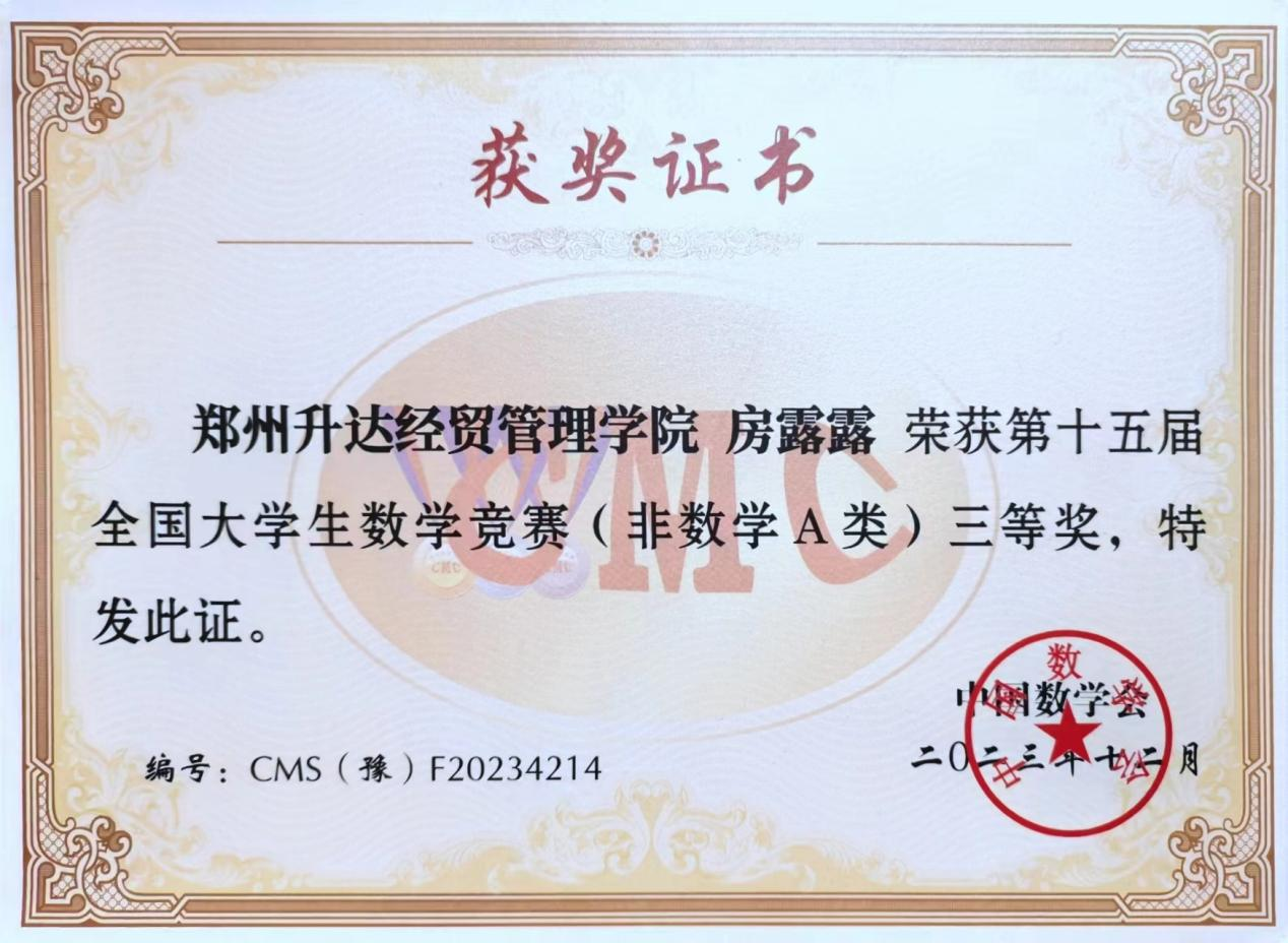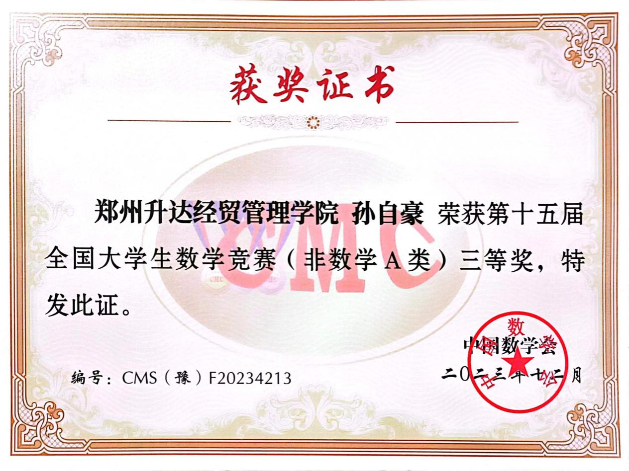 近日,2023年第十五届全国大学生数学竞赛河南赛区成绩公布,9428cn太阳集团学子斩获佳绩,共有6名同学获得非数学A类奖项,其中20级汽服1班王雪冰同学获得省级一等奖,20级汽服1班李佳慧同学、20级汽服2班王佳莉同学获得省级二等奖,20级汽服2班孙自豪同学、房露露同学、马芙雨同学获得省级三等奖。