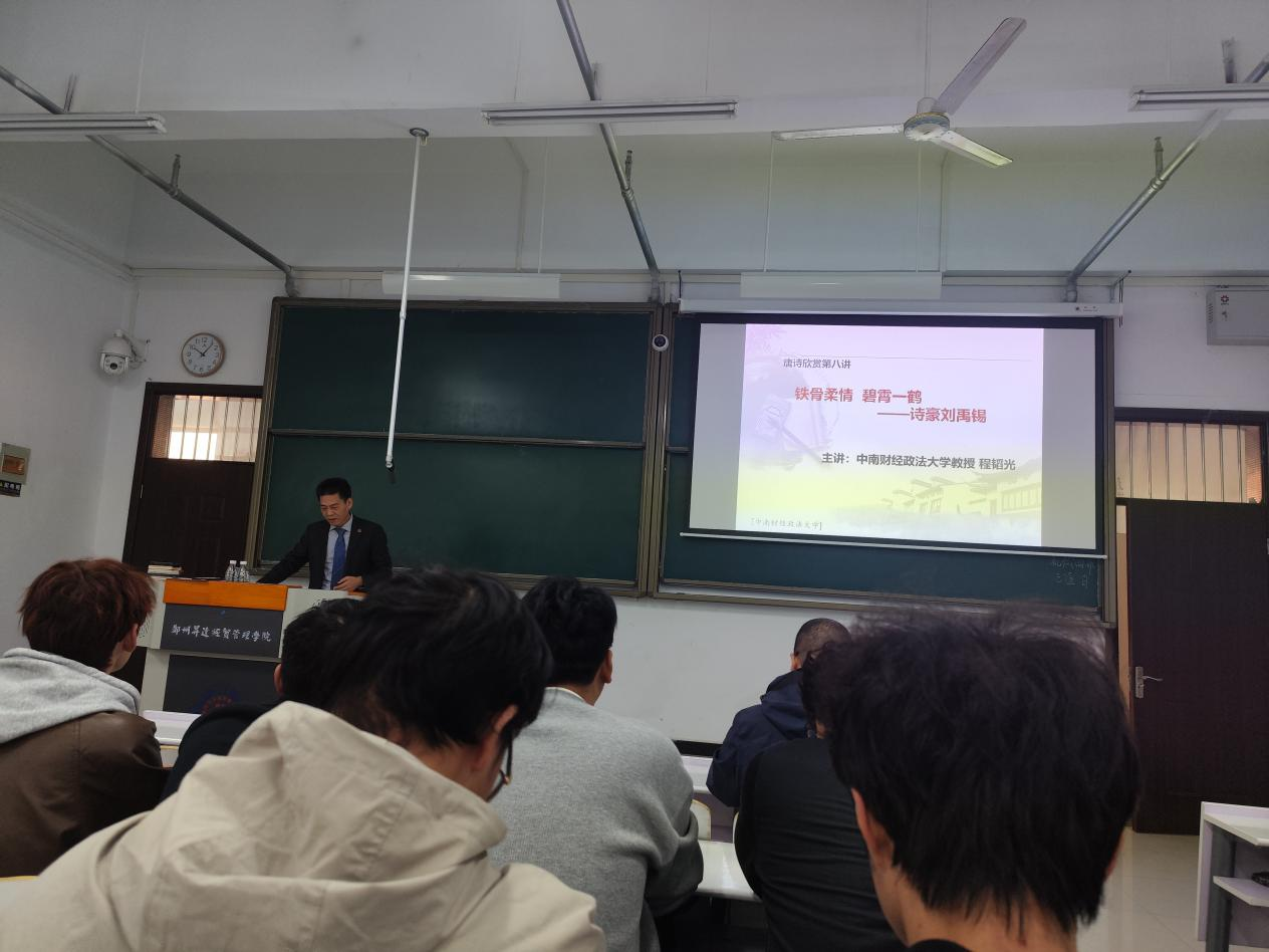 为弘扬中华优秀传统文化,提升新时代大学生人文素养,11月8日,9428cn太阳集团邀请中南财经政法大学新闻与文化传播学院程韬光教授,于东校区实训大楼609教室成功举办“铁骨铮铮碧霄一鹤——刘禹锡”学术讲座,9428cn太阳集团党委书记丁向育主持。