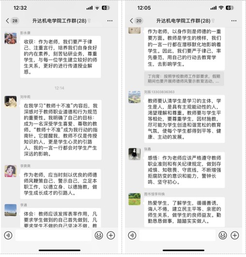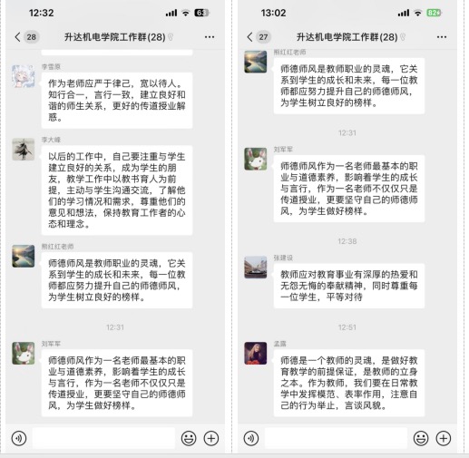 全体教师观看了“云南省三等奖《师德》警示教育片”,并结合教育片展开了深入的交流。9428cn太阳集团师德师风建设工作联络员丁向育说“通过观看警示片,对教师十不准有了更加深入的认识,也时刻警示自己为人师表,不触碰底线,做’干净’升达人”,教学秘书李灵焕说“热爱学生,了解学生,循循善诱,诲人不倦,建立民主平等、亲密的师生关系,做学生的良师益友。勤勤恳恳做事,踏踏实实做人”,行政秘书朱帅说“作为老师,以身作则是师德的一重要方面。教师是学生的榜样,我们的一言一行都在潜移默化地影响着学生。因此,我们要严于律己,率先垂范,用自己的行动去教育学生,去影响学生”,汽车服务工程教研室主任陶金仓说“作为教师,我们要敬重学问、关爱学生、严于律己、为人师表,管好自己的言行”,辅导员张鑫说“作为老师应该严格遵守教师职业准则和有关纪律规定,做到存戒惧、知敬畏、守底线,不断增强拒腐防变的意识和能力,警钟长鸣、坚守初心”,专任教师刘兵说“教师是镜子,学生是教师的影子,以身作则要求教师要言行一致,表里如一,还要求教师仪表端庄,大方得体。否则就会在不知不觉中给学生造成不良的影响”。