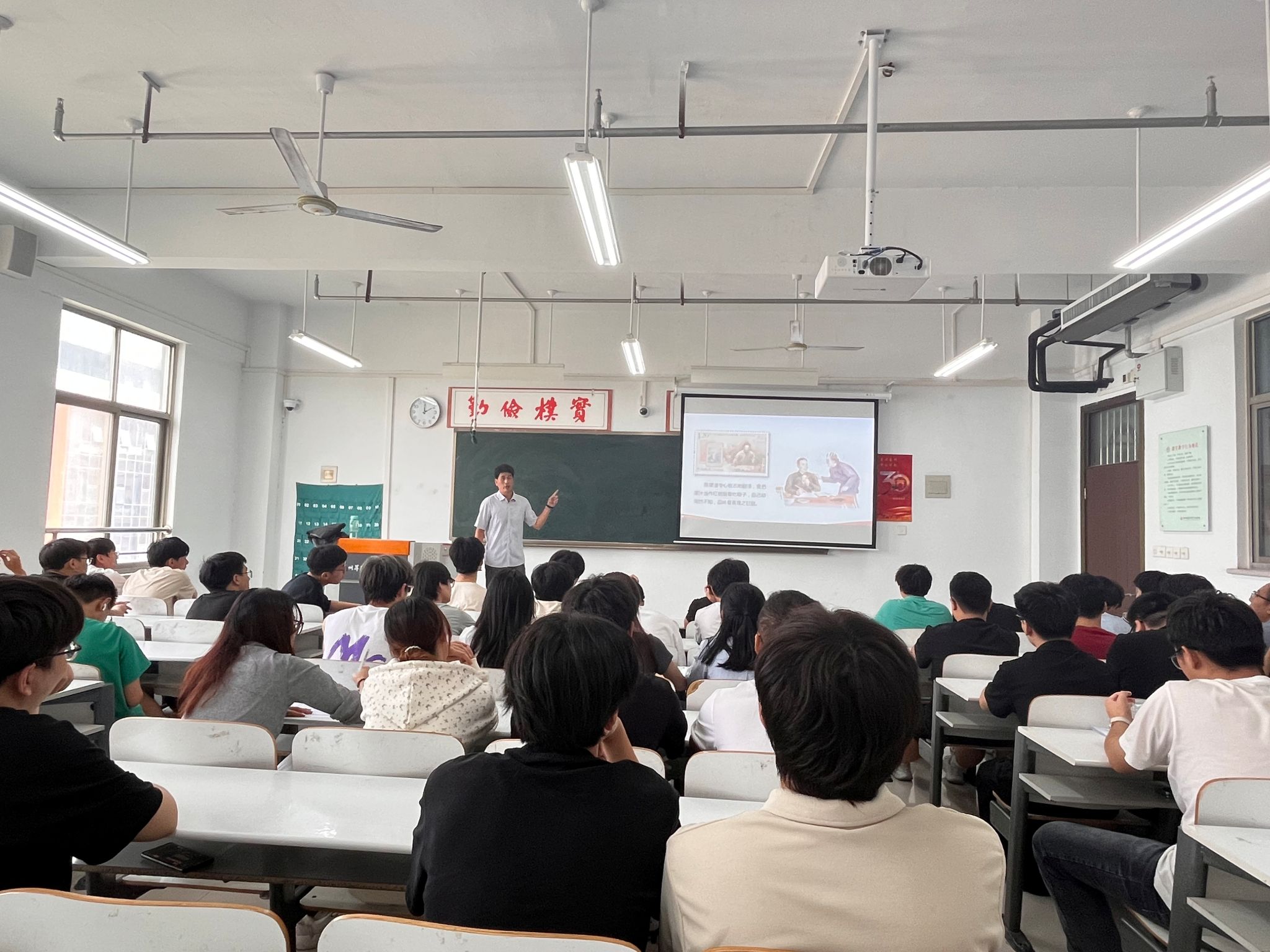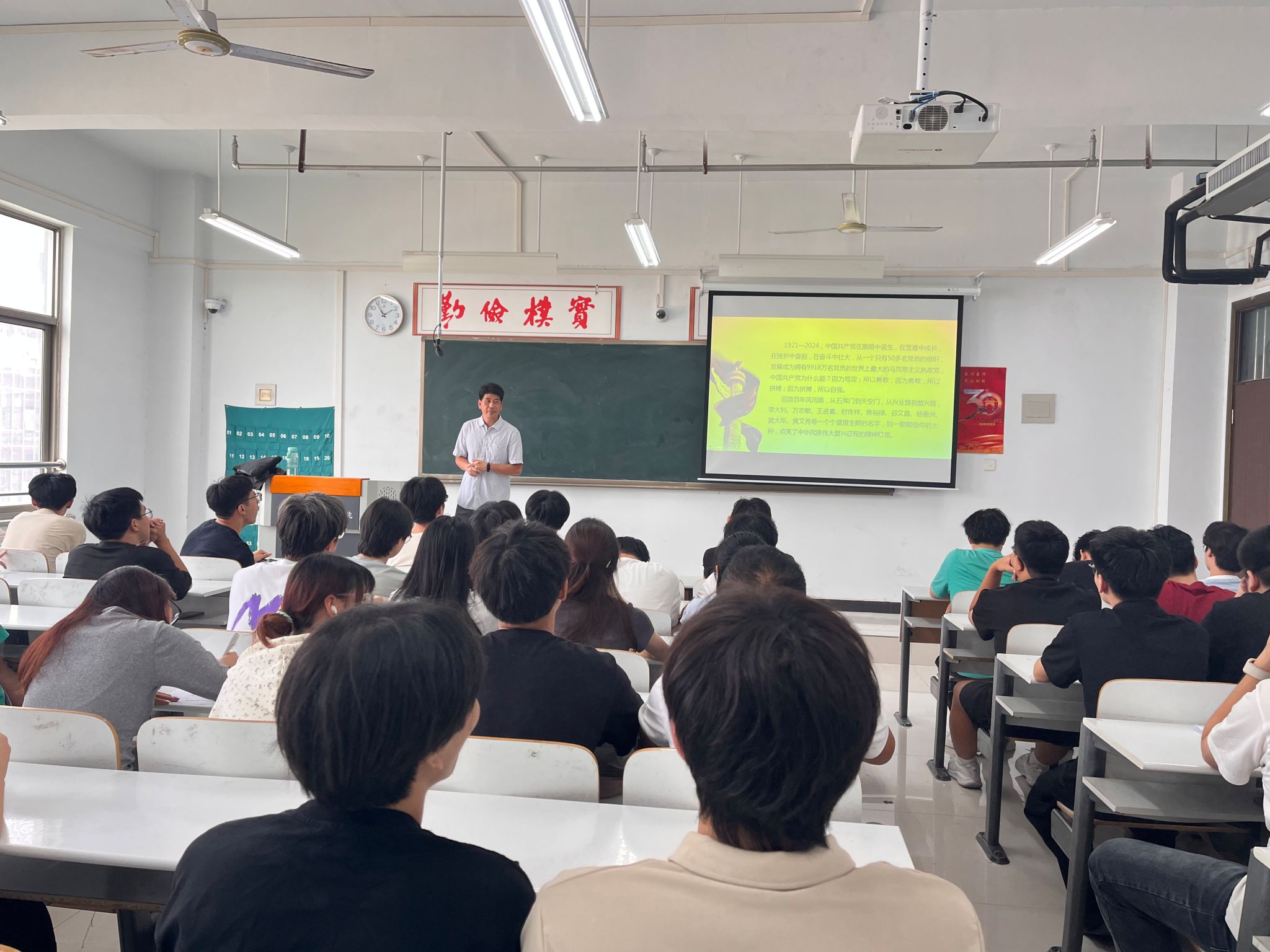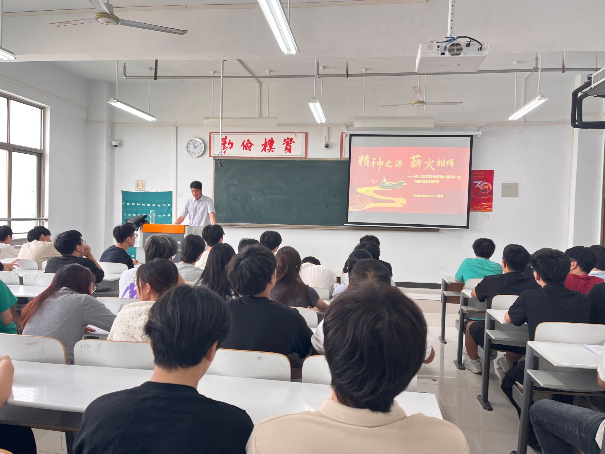 9月29日,9428cn太阳集团党委书记丁向育在建工楼515教室为2023级汽车服务工程本科1班讲授“2024年秋季开学思政第一课”,授课主题为“精神之源薪火相传--伟大建党精神奠定中国共产党人精神谱系根基”。