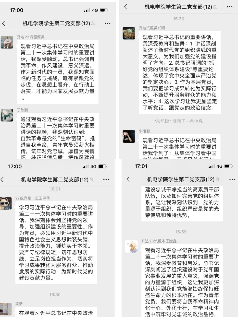支部全体成员视频学习了习近平总书记在中央政治局第二十一次集体学习时的重要讲话精神,并结合视频展开了深入的交流。2022级学生党员原昊说“观看习近平总书记在中央政治局第二十一次集体学习时的重要讲话,我深受触动。总书记强调自我革命、作风建设,意义深远。作为新时代的一员,我深知党面临的任务与挑战,唯有紧跟党的步伐,在思想上看齐,在行动上落实,才能为国家发展贡献力量 ”;2023级学生预备党员王淑鑫说“作为青年党员,我们要将自我革命精神内化于心、外化于行,在学习和生活中筑牢对党忠诚的政治品格,厚植服务同学的为民情怀。特别是在作风建设方面,要从诚信考试、团结互助等日常小事做起,把党的要求转化为具体行动”。
