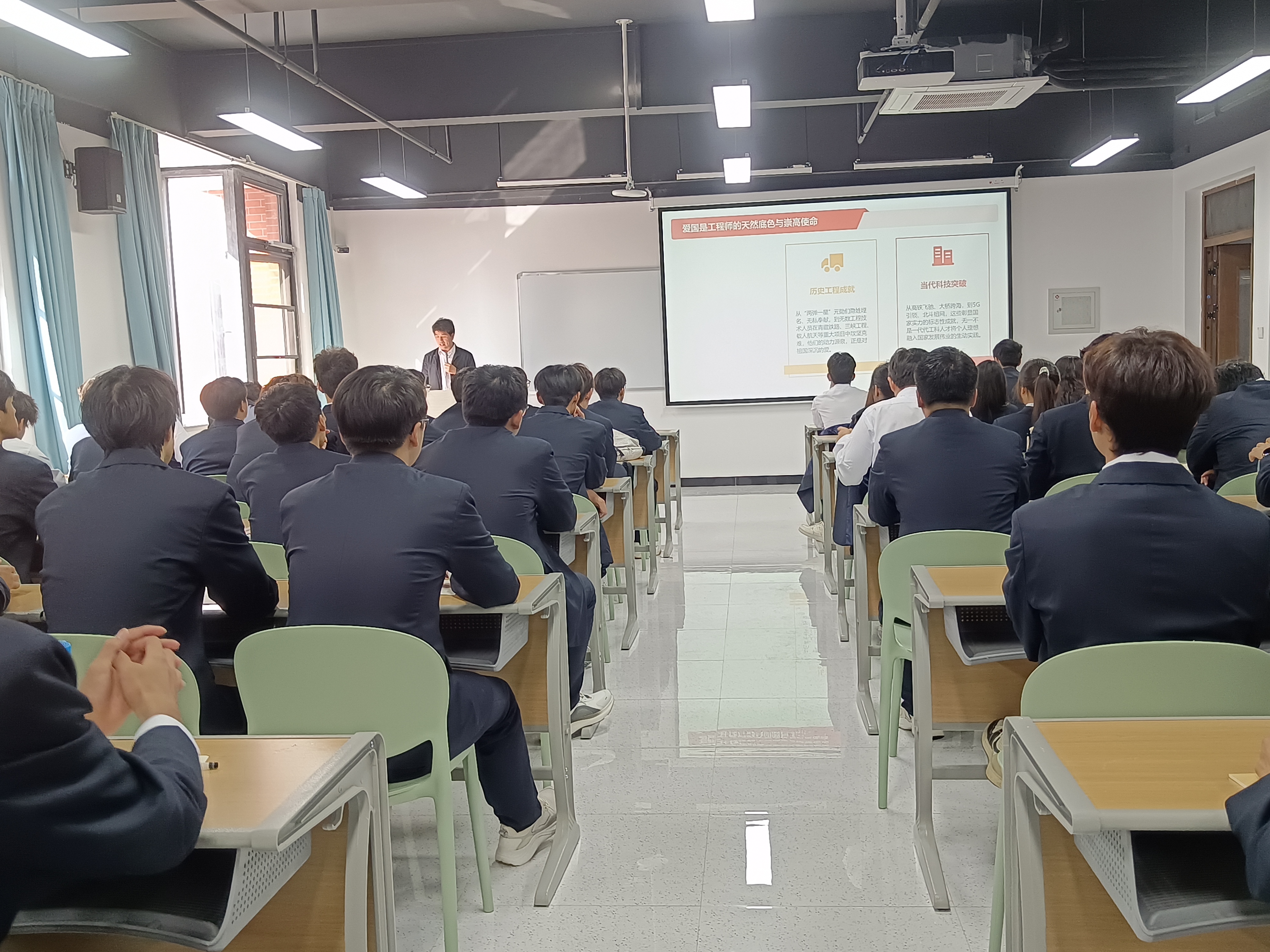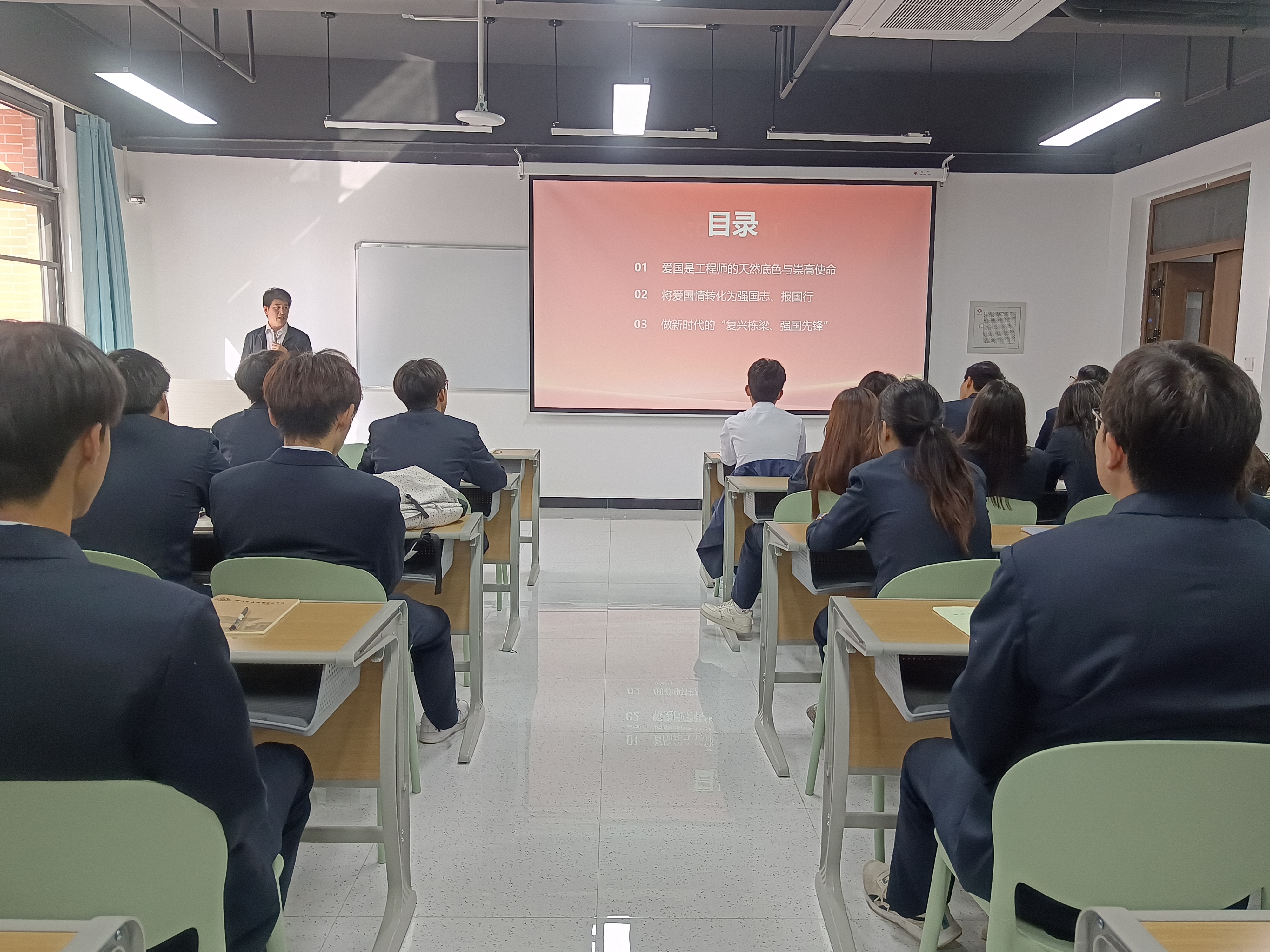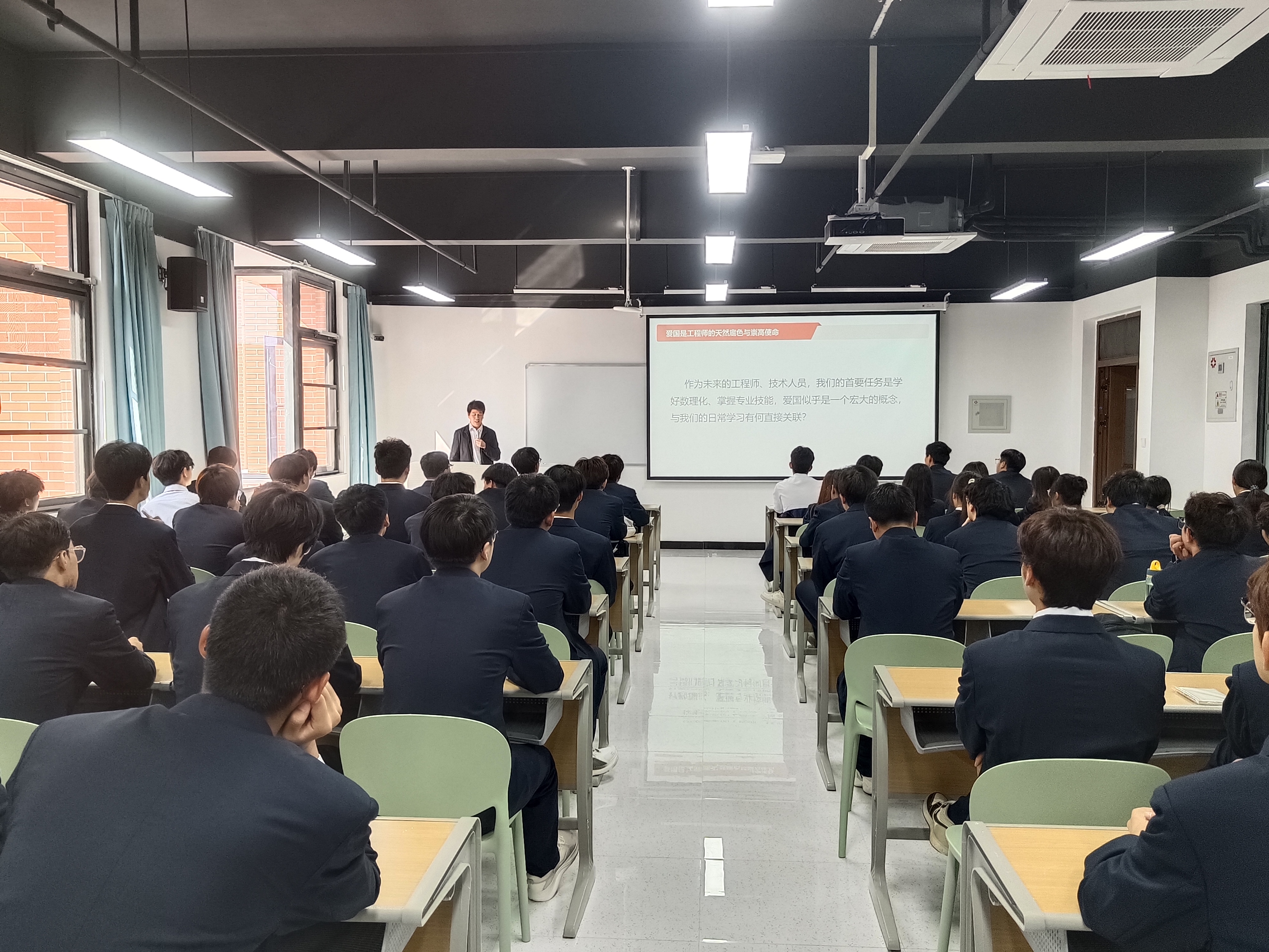 丁书记的开学思政第一课围绕“爱国是工程师的天然底色与崇高使命、将爱国情转化为强国志报国行、做新时代的复兴栋梁强国先锋”三个方面展开。在“爱国是工程师的天然底色与崇高使命”部分,他解答了新生心中“学习与爱国如何关联”的疑问,并强调,爱国主义并非遥不可及的空洞口号,而是融入工科人血脉的精神基因。在“将爱国情转化为强国志报国行”部分,他结合新生学习生活实际,提出了三点具体要求。一是要立鸿鹄之志,将个人理想与国家需求紧密结合;二是要练就过硬本领,以真才实学服务社会、贡献国家;三是要涵养家国情怀,培养严谨求实、精益求精的工匠精神。在“做新时代的复兴栋梁强国先锋”部分,他勉励大家要将“报国”二字刻在心中,把爱国主义精神转化为刻苦学习的动力,努力成长为兼具家国情怀、创新精神与实践能力的卓越工程师后备军。