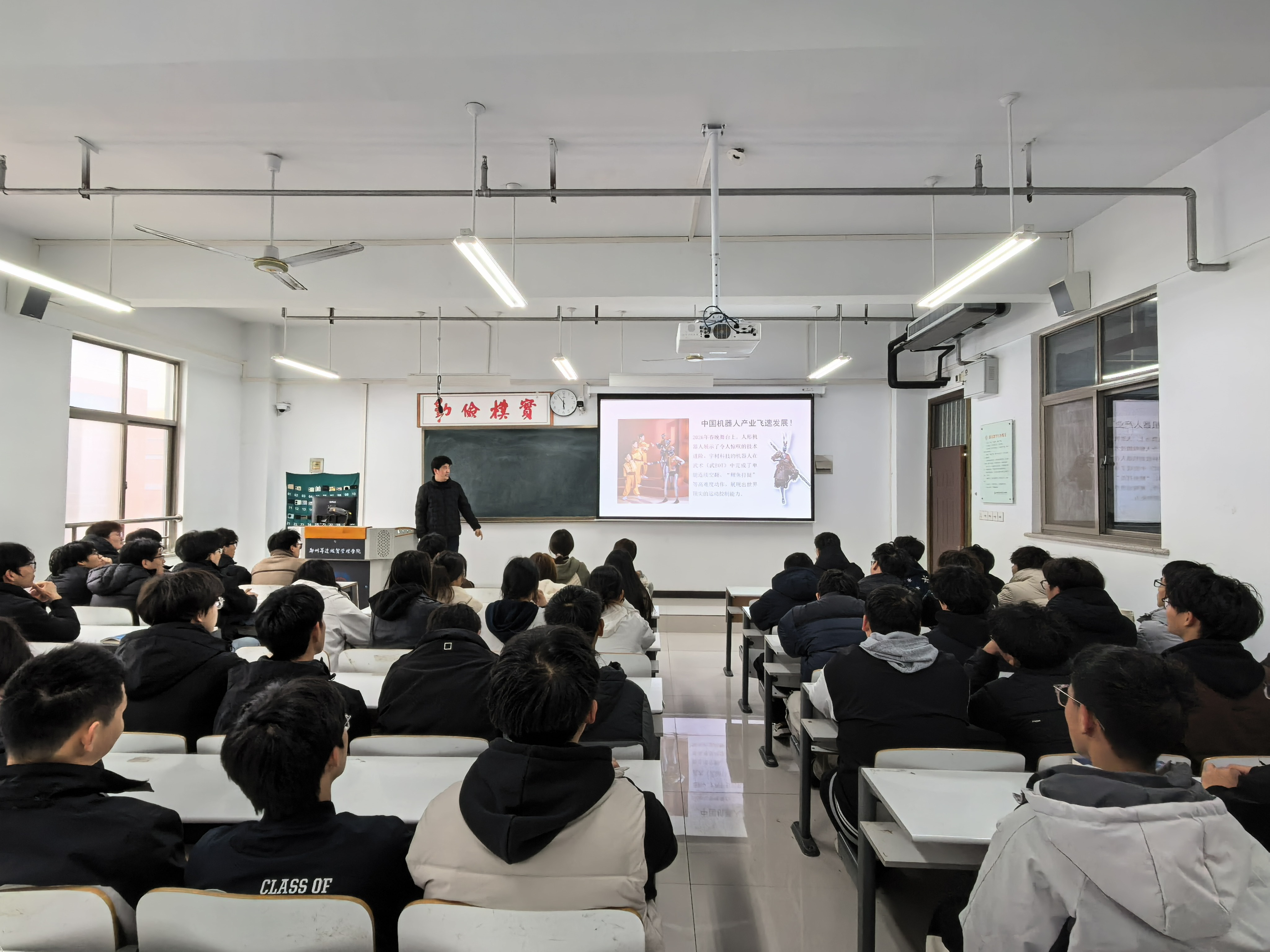 丁书记围绕“马上分享、马上收心、马上平安、马力全开”四个层面进行授课。在“马上分享”环节,他结合2026年春晚科技亮点,讲述了人形机器人完成高难度动作、陪伴式机器人实现情感交互等案例,展现了我国机器人产业的发展成就,引导学生关注科技前沿,激发专业学习热情。“马上收心”部分,他鼓励同学们尽快调整状态,回归校园节奏,夯实专业基础,提升实践能力。“马上平安”环节,丁书记重点强调了防诈骗、网络安全、意识形态安全等内容,提醒大家牢固树立安全意识,加强自我防护。“马力全开”部分,他对同学们提出三点希望:一要心怀家国、立志报国,将个人发展融入制造强国建设;二要脚踏实地、刻苦钻研,提升解决复杂工程问题的能力;三要勇于担当、乐于奉献,积极参与社会实践,在实干中彰显青春价值。
